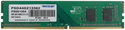 Оперативная память Patriot Signature Line [PSD44G213382] использует напряжение питания, равное 1.2 В. Чипы памяти установлены с обеих сторон модуля. Модель изготовлена с использованием текстолита традиционного, зеленого цвета. На модуль нанесена наклейка с информацией о технических характеристиках устройства. Память упакована в коробку, изготовленную из прозрачного пластика. Упаковка обеспечивает достаточный уровень защиты устройства от механических повреждений.