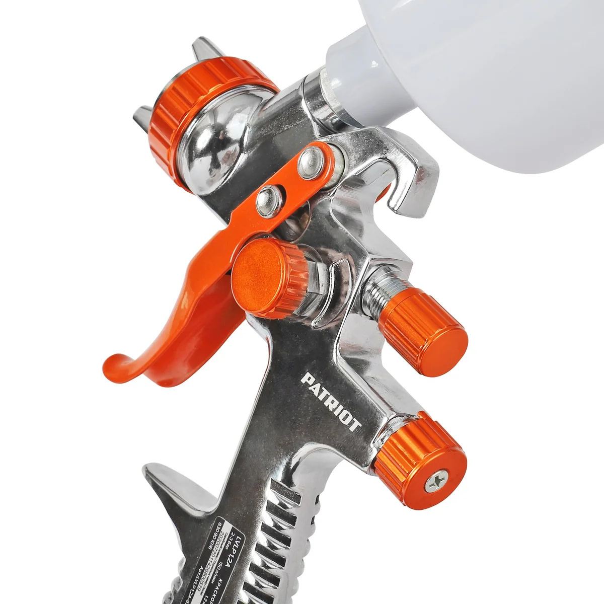 Пневмокраскораспылитель Patriot LVLP 1,2A низкого давления с верхним бачком для нанесения краски на различные поверхности. Изготовлен из сплава алюминия. Используется на автосервисе в покрасочном цехе, а также везде, где требуется покраска или подкраска - в быту и на производстве.