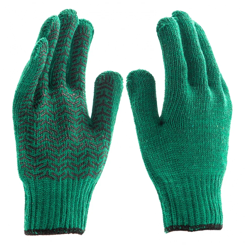 Перчатки трикотажные, х/б, ПВХ точка, цвет нанесения: зеленый, 4 нити, 7 класс Сибртех 68073
