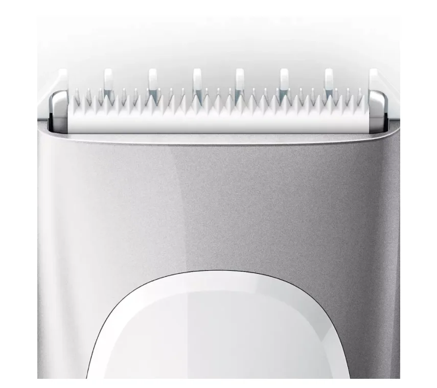 Безопасная система лезвий с укороченными керамическими ножами и закругленными лезвиями легко и бережно захватывает и подстригает мягкие детские волосы, не оставляя царапин на коже.