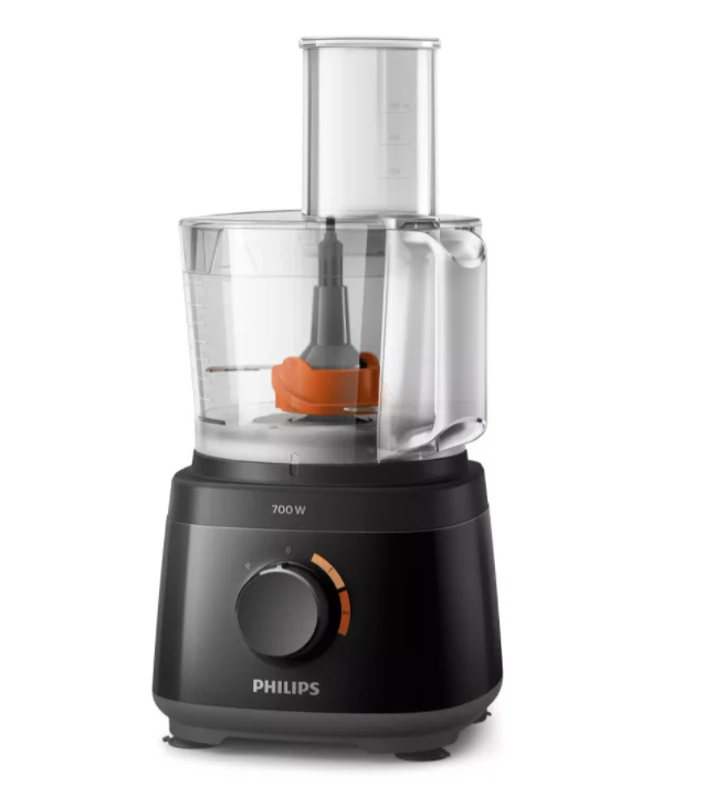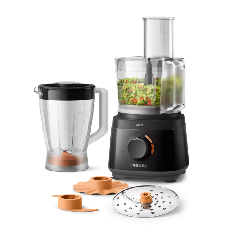 Компактный кухонный комбайн занимает меньше места на кухонном столе, но при этом располагает всеми необходимыми аксессуарами, которые можно легко хранить внутри чаши.