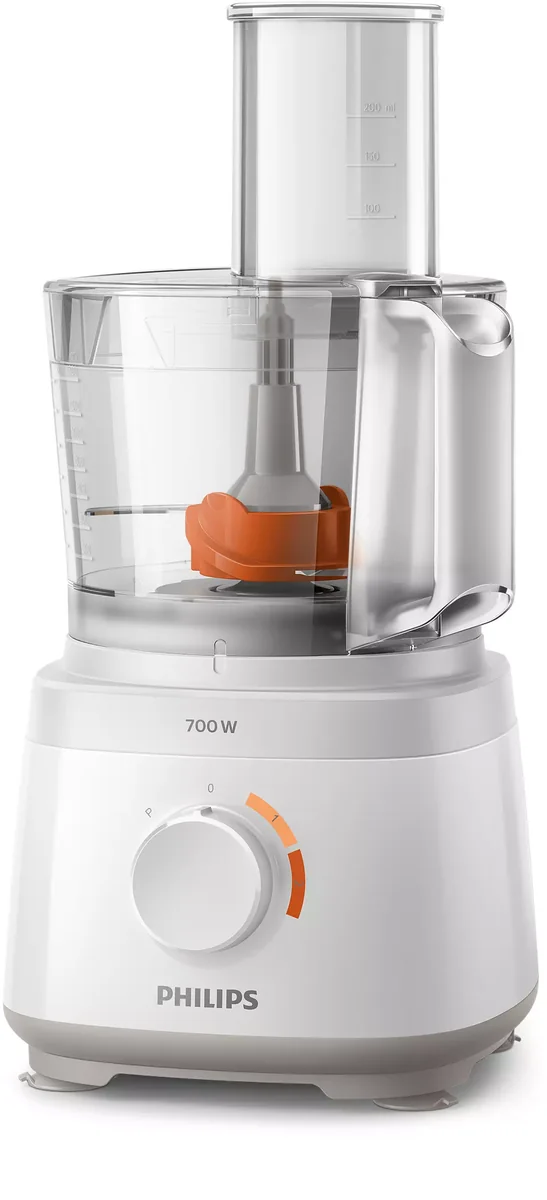 Компактный кухонный комбайн занимает меньше места на кухонном столе, но при этом располагает всеми необходимыми аксессуарами, которые можно легко хранить внутри чаши.