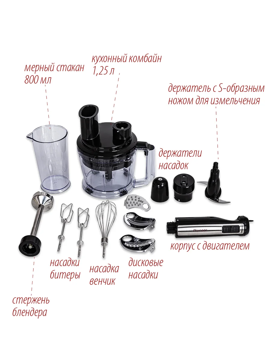 Комплектация: блендер, измельчитель, мерный стакан, насадки, гарантийный талон, инструкция на русском языке
