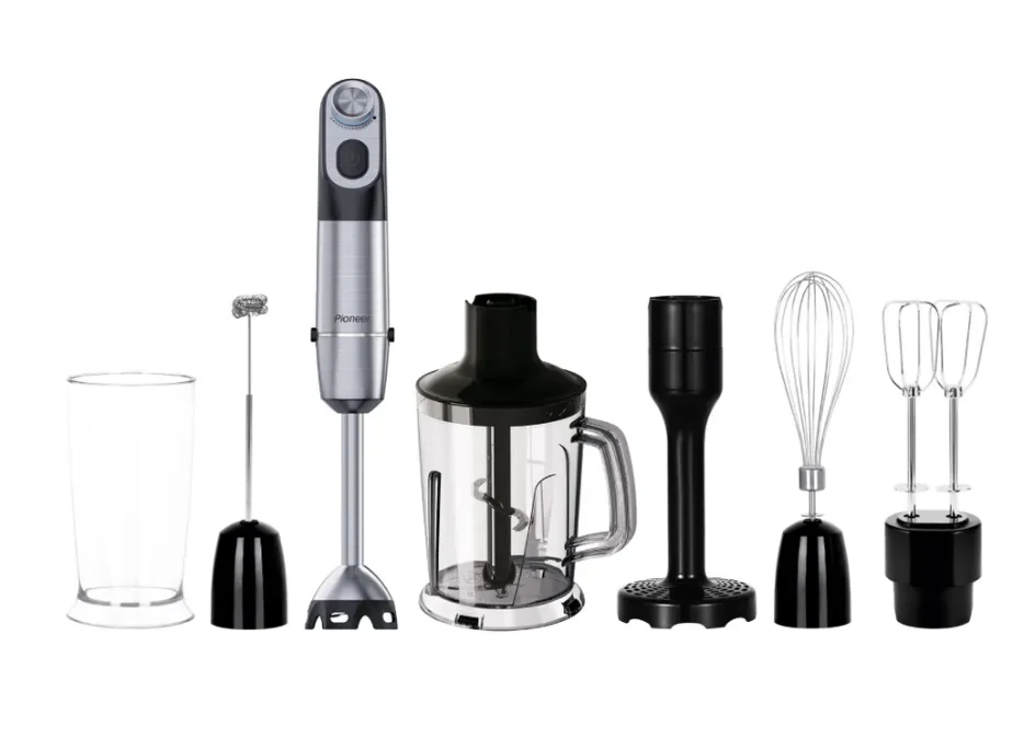 - В комплекте - венчик, мерный стакан (600 мл), крышка к стакану, насадка для пюре, чаша, нож, насадка-блендер, насадка для вспенивания молока, насадка-миксер