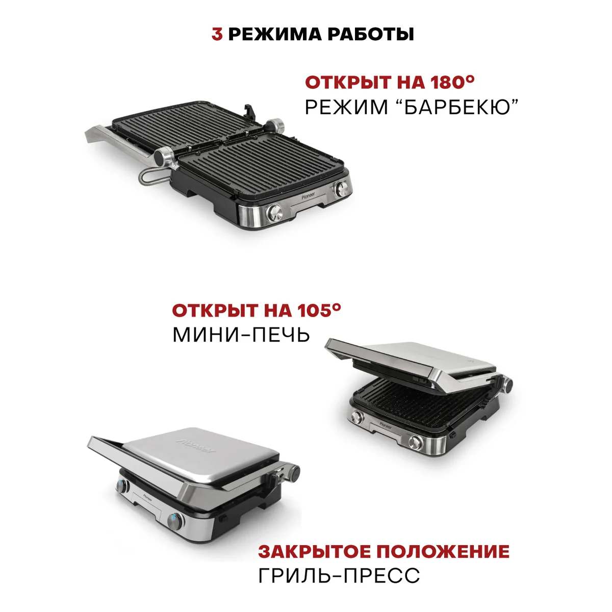 - Комплектация: электрический гриль, 2 съемные панели, сменная панель, поддон для сбора жира, пластиковая лопатка, гарантийный талон, инструкция на русском языке