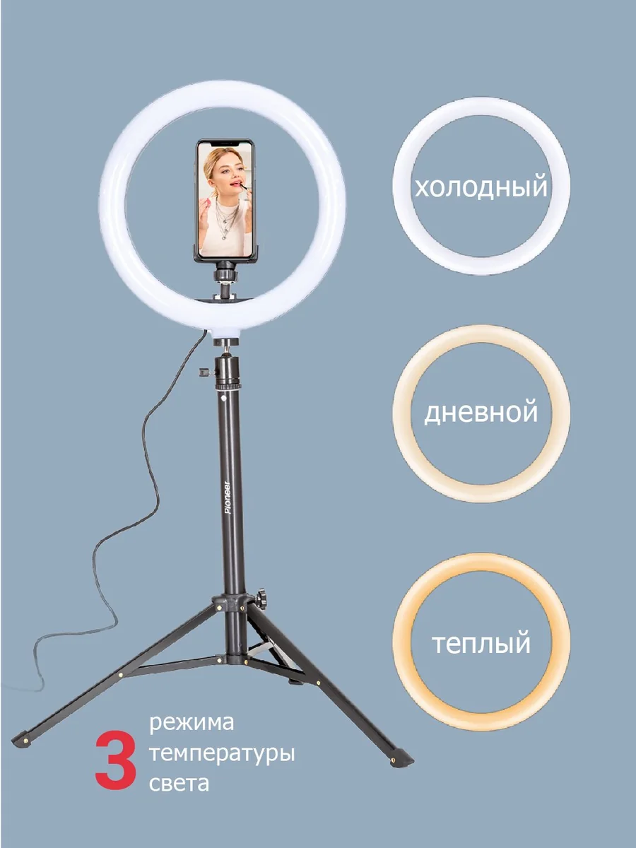 Кольцевая светодиодная лампа Pioneer служит основным или дополнительным источником освещения, равномерно рассеивает свет и призвана скрыть блики, лишние тени и изъяны при при фото- или видеосъемке, потоковой видеотрансляции, при съемке селфи, видео блогов, видеозаписей, или макросъемки и т. д. Осветитель Pioneer поможет добиться правильного, яркого, равномерного освещения при любой съемке. Кольцевая светодиодная лампа Pioneer может использоваться также в качестве источника света для макияжа или маникюра, в качестве настольной лампы, торшера или ночника. Расположение источника света вокруг смартфона помогает добиться правильного, яркого, равномерного освещения при съемке и минимизирует тени. Лампа питается от стандартного порта USB. Ей не требуется встроенной батареи или специализированного адаптера питания. Она будет одинаково хорошо работать с большинством устройств, имеющих порт USB, таких как ноутбук, ПК, POWERBANK, зарядное устройство USB и т. д. Яркость светодиодного источника света регулируется в широких пределах. Три режима цветовой температуры – теплый белый свет, дневной (естественный) свет и холодный белый свет – позволяют добиться необходимых вам визуальных эффектов и обеспечивают совместимость со светочувствительными материалами с разной спектральной чувствительностью. Гибкий держатель для смартфона и держатель лампы с шарнирной головкой дают свободу в выборе ракурса съемки. Входящий в комплект настольный штатив позволяет устанавливать лампу на столе или других горизонтальных поверхностях.