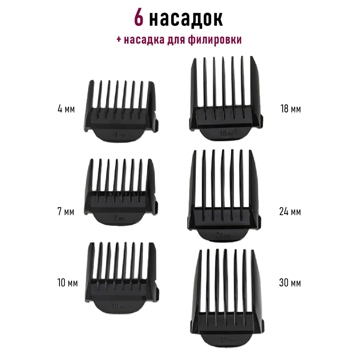 - Насадки: 7 съемных регулируемых насадок 4/7/10/18/24/30 мм, насадка для филировки