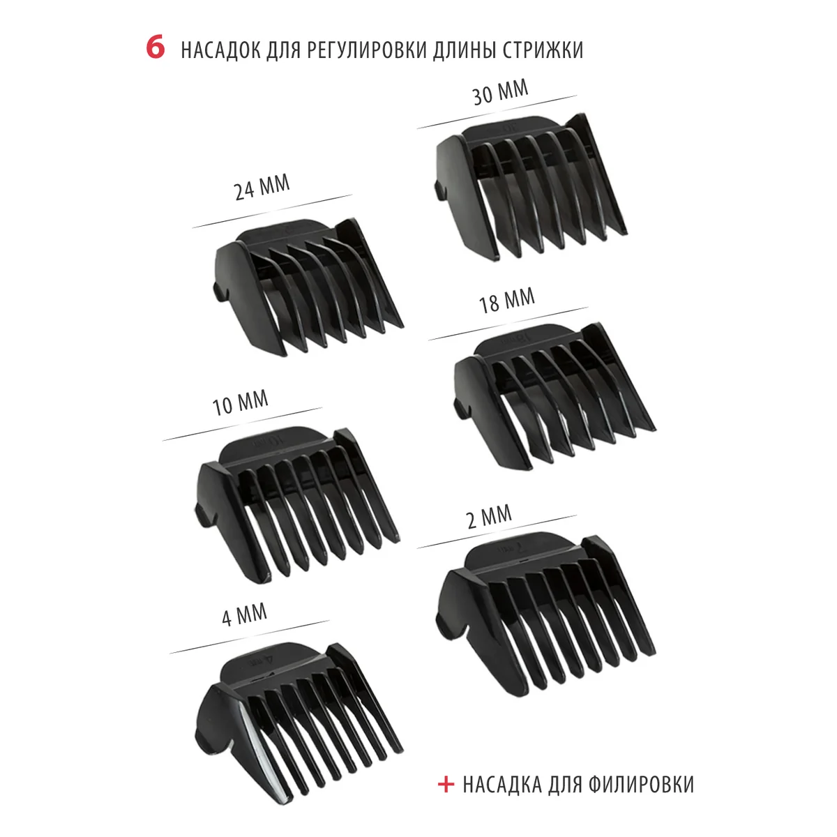 - Насадки: 7 съемных регулируемых насадок 4/7/10/18/24/30 мм, насадка для филировки