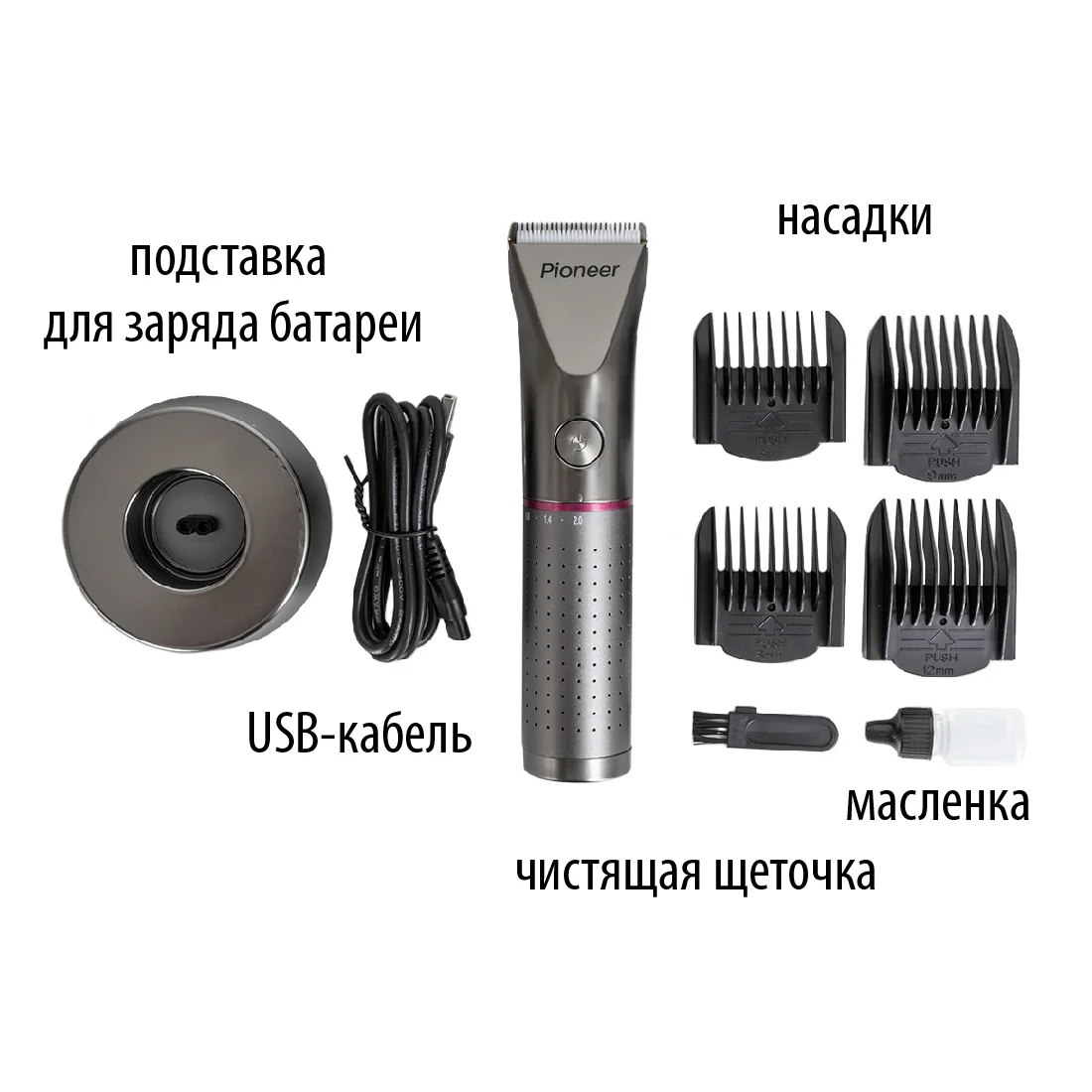 - Комплектация: машинка для стрижки, съемные насадки, масло, щеточка для чистки, USB кабель, подставка для заряда батареи, гарантийный талон, инструкция на русском языке