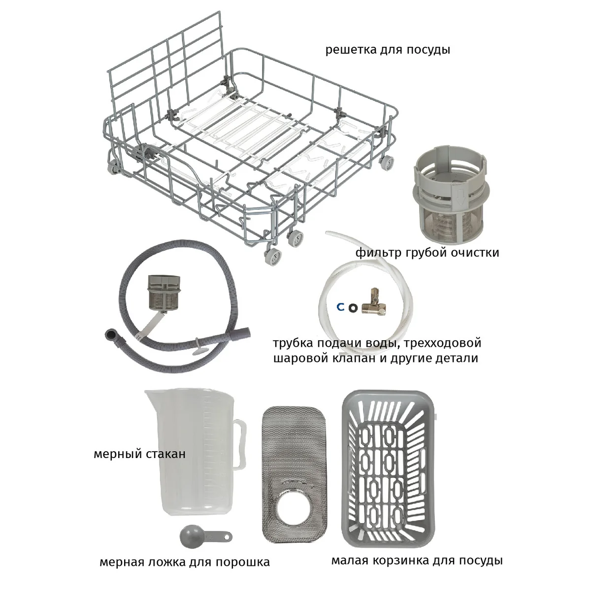 - Комплектация: посудомоечная машина, верхняя полка для посуды, корзина для посуды, дренажная трубка, малая корзинка для посуды, мерный стакан, мерная ложка для порошка, трубка подачи воды, трехходовой шаровой клапан, гарантийный талон, инструкция на русском языке