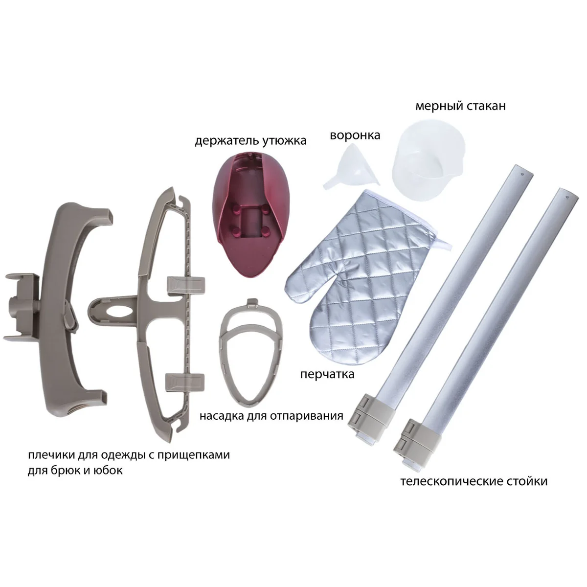 - Комплектация: отпариватель, регулируемая телескопическая стойка, держатель утюжка, паровой утюжок, гибкий шланг в защитной оболочке, воронка, мерный стакан, насадка для отпаривания, плечики для одежды с прищепками для брюк и юбок, перчатка, гарантийный талон, инструкция на русском языке
