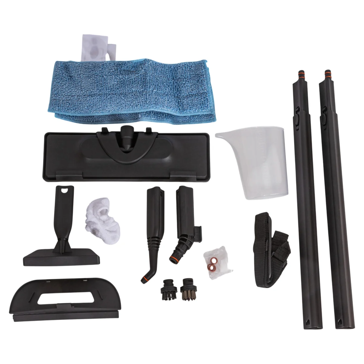 - Комплектация: пароочиститель, подставка для аксессуаров, удлинительные трубки 2 шт., насадка плоская, насадка для стеклянных изделий, основная насадка, насадка-швабра, насадка на швабру, коннектор на швабру, ремень для переноски на плече, насадка из текстиля, насадка круглая металлическая щетка, насадка круглая нейлоновая щетка, текстильная насадка на швабру, мерный стакан, руководство по эксплуатации, гарантийный талон