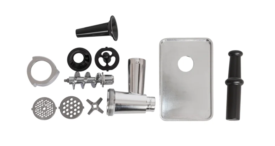 - Комплектация: мясорубка, металлический загрузочный лоток, толкатель для продуктов, 2 решетки, насадка для приготовления сосисок, насадка для приготовления кеббе, руководство по эксплуатации, гарантийный талон