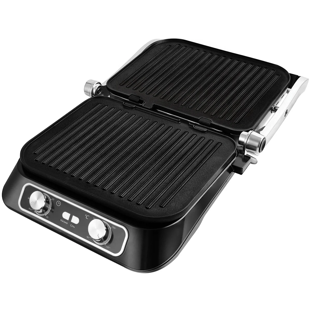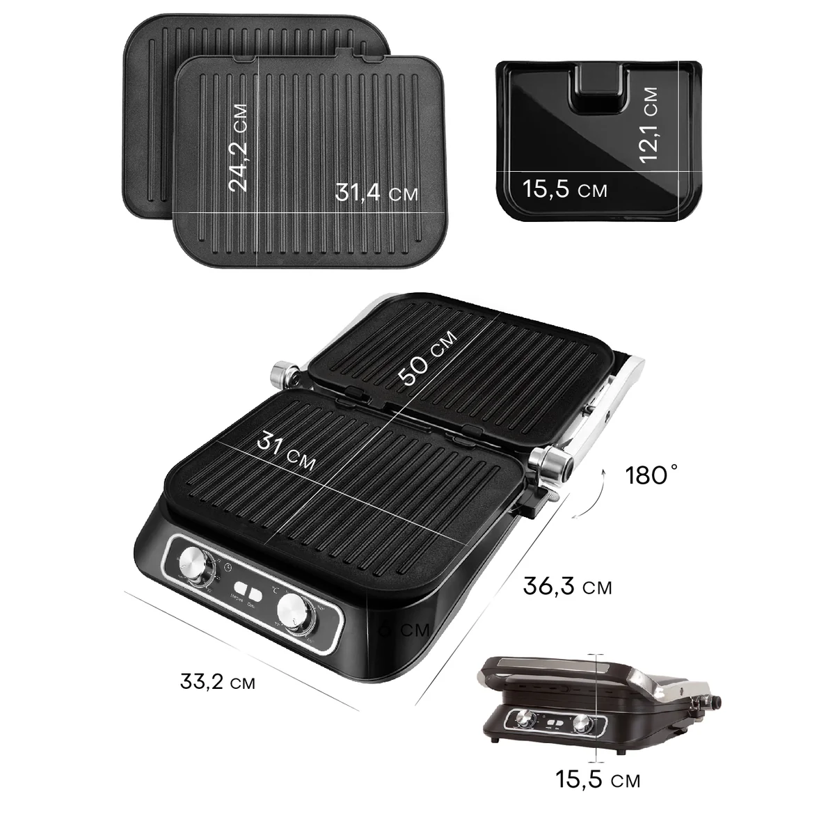В зависимости от своих задач и предпочтений, вы можете готовить блюда на гриле под крышкой и в открытом режиме, когда обе панели, верхняя и нижняя, раскрываются в одной плоскости, как одна большая жарочная поверхность.