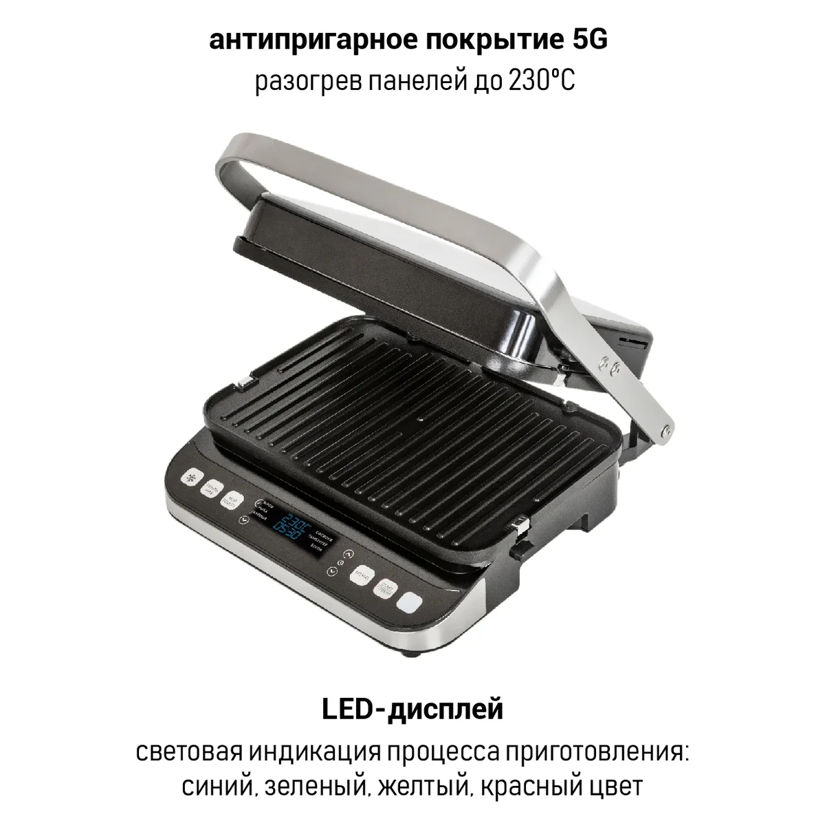 Многофункциональный электрический гриль Pioneer GR1022E оснащен шестью автоматическими режимами работы для приготовления мяса, рыбы, курицы, колбасы, гамбургеров и бекона. Готовить вы сможете как в закрытом гриле, так и в открытом на 180 градусов. Гриль оснащен регулировкой температуры и времени приготовления, вся информация о настройках будет отображаться на дисплее прибора. В комплекте с грилем поставляется термощуп для измерения температуры внутри продукта. Также при помощи нашего гриля вы сможете приготовить венские или бельгийские вафли - в комплекте для них предусмотрены сменные панели.