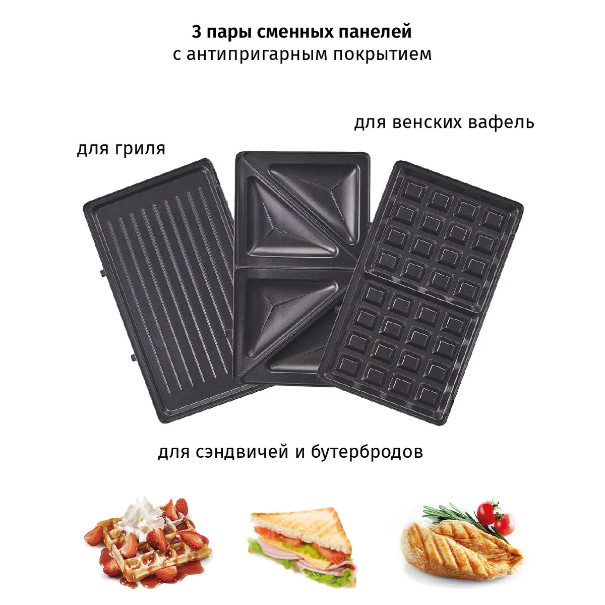 - Комплектация: электрический гриль, панели-гриль, панели для сэндвичей, панель для венских вафель, гарантийный талон, инструкция на русском