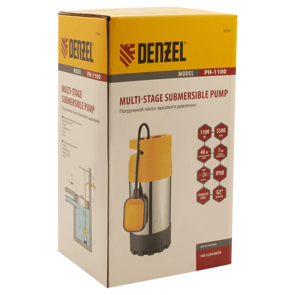Погружной насос Denzel PH1100 97234 мощностью 1100 Вт и производительностью 5500 л/ч создает напор до 40 м и используется для подачи чистой воды под давлением до 4 бар из резервуара, водоема и колодца, даже если он находится далеко от участка. Позволяет организовать систему орошения и водоснабжения на даче. Скорости работы до 91 л/мин и напора до 40 м достаточно для подачи воды на верхние этажи в несколько точек водоразбора.ПреимуществаНадежность — корпус из нержавеющей стали, торцевое уплотнение из карбида кремния, импеллеры из стеклонаполненного пластика и медная обмотка двигателя рассчитаны на длительное использование.Автономная работа — конструкцией предусмотрен поплавковый выключатель, обеспечивающий защиту от сухого хода.Термозащита — двигатель автоматически отключается при перегреве, что предотвращает его поломку.Безопасность — сетевой кабель с проводом заземления предохраняет пользователя от поражения электрическим током.Герметичность — насосу присвоена степень защиты IPX8, а значит, внутренние компоненты надежно защищены от попадания воды.Быстрая подготовка к работе — достаточно прикрепить трос к ручке и опустить насос в колодец вертикально до полного погружения в воду.Компактность — устройство удобно для использования в узких колодцах.Длина кабеля 10 м — насос можно погружать даже в глубокие резервуары и колодцы.Удобная транспортировка и погружение — устройство весит 8,8 кг и снабжено удобной ручкой.Гарантия 3 года — высококачественное исполнение подтверждено производителем.