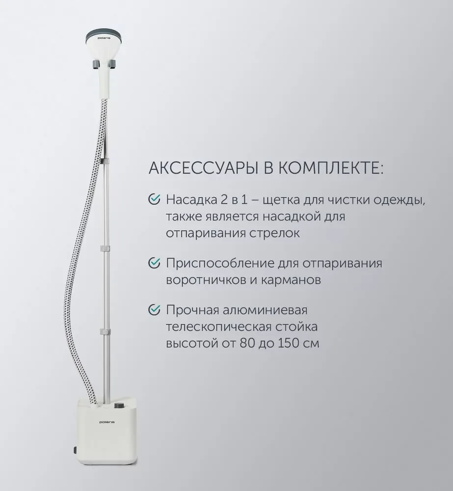- Приспособление для отпаривания воротничков и карманов; - Прочная алюминиевая телескопическая стойка высотой от 80 до 150 см. Мощность 1800 Вт.