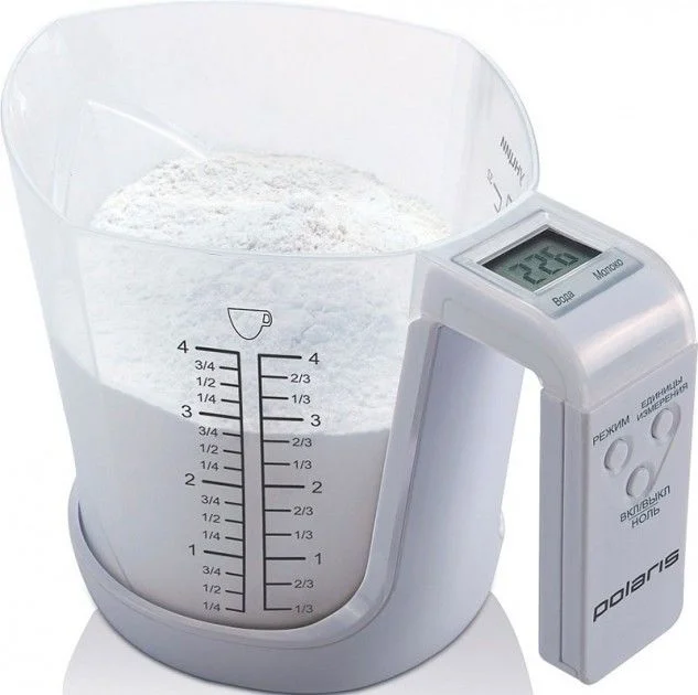 | Особенности | Тип управления: кнопочное Индикация перегрузки Индикация низкого заряда батареи Автоматическое и ручное отключение Жидкокристаллический дисплей Цена деления: 1 г Элемент питания: СR2032 Объем чаши: 1 л Измерение объема молока, воды, масла, муки Измерения жидкости в мл, унциях, стаканах Нескользящие ножки |