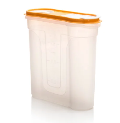 - Банка изготовлена из высококачественного пищевого пластика, не имеющего сторонних химических запахов. Она обеспечивает надежное хранение сыпучих продуктов, круп, макаронных изделий в герметично закрытой емкости, в которую не проникают сырость и сторонние запахи.
