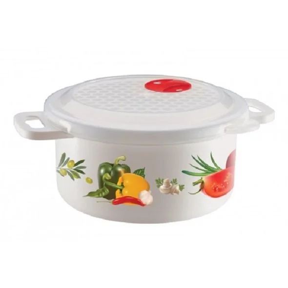 Емкость для холодильника и микроволновой печи украшена ярким, красочным декором, что делает её нарядной и привлекательной. Изделие сочетает в себе традиционную форму и современный дизайн. Емкость многофункциональна. В ней можно разогревать, замораживать, хранить и подавать на стол различные продукты, в том числе супы. Разогревать пищу можно, не снимая крышки (при открытом клапане), что предохраняет внутреннюю поверхность микроволновой печи от загрязнения. Декор надежно держится на изделиях при использовании, не смывается при контакте с водой.