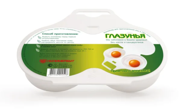 Яичница, приготовленная в контейнере "Глазунья" не только вкусная и свежая, но и имеет аккуратный внешний вид и будет красиво смотреться на сервированном столе. Это достигается за счет специальной формы контейнера, который подразделен на две аккуратные емкости, в которых продукты не растекаются и не смешиваются между собой.