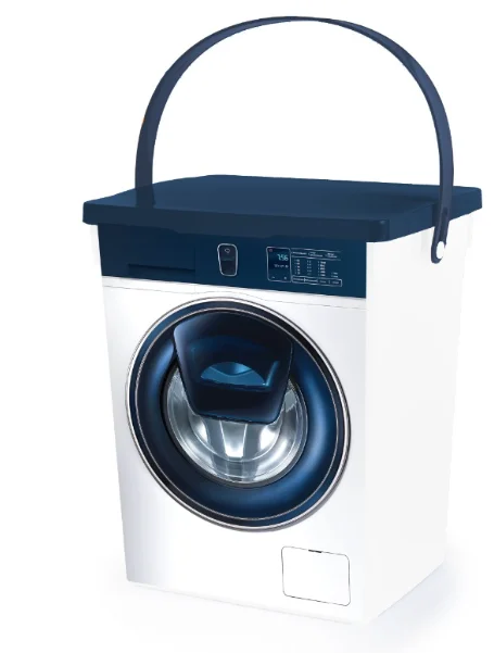 С внешней стороны изделие стилизовано под стиральную машину при помощи нанесенного с использованием технологии IML изображения. Такой контейнер не обязательно прятать в шкаф, ведь он настолько стильный и красивый что его можно смело оставить на виду, и он прекрасно дополнит интерьер ванной комнаты.
