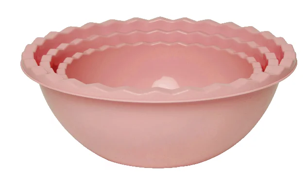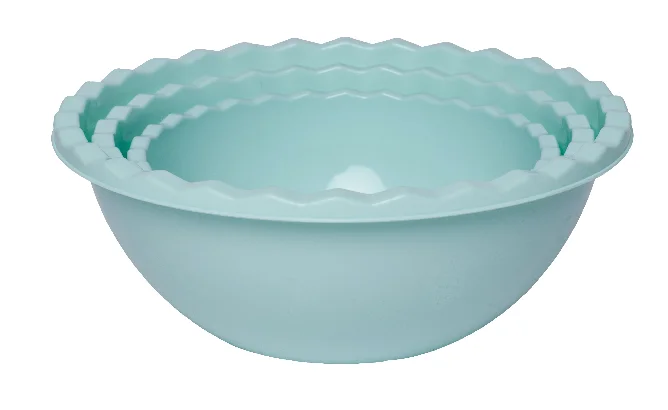 - Набор состоит из трех мисок различного размера. Миски имеют стильный дизайн, волнистые края. Изделия легко мыть, возможно это делать в посудомоечной машине. После использования миски не занимают много места, так как в пустом виде легко умещаются одна в другую.