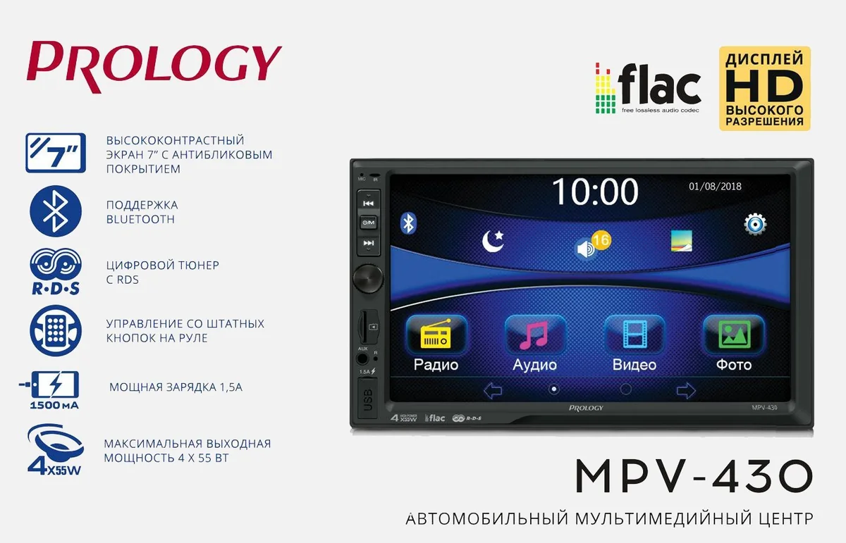 Автомобильный мультимедийный центр PROLOGY MPV-430 монтажного размера 2DIN обеспечивает прием радиостанций в диапазонах FM/УКВ, воспроизведение медиафайлов, записанных на карты памяти USB/microSD, управление мобильным телефоном через интерфейс Bluetooth®, а также передачу звука с внешних источников. Поддерживается подключение штатных кнопок управления аудиосистемой на руле (интерфейс SWC).