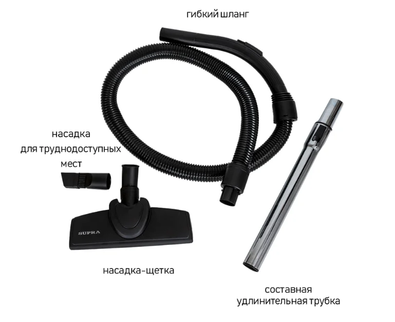 пылесос, универсальная щетка ковёр/пол, щелевая насадка, гарантийный талон, инструкция на русском языке