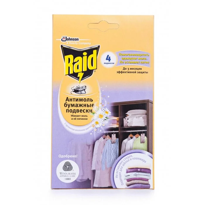 Бумажные подвески «Весенние цветы» от Raid – эффективное средство для избавления от моли. Продукт основывается на трансфлутрине – действующем веществе, которое уничтожает личинки и взрослые особи моли. Действует на протяжении 90 дней.