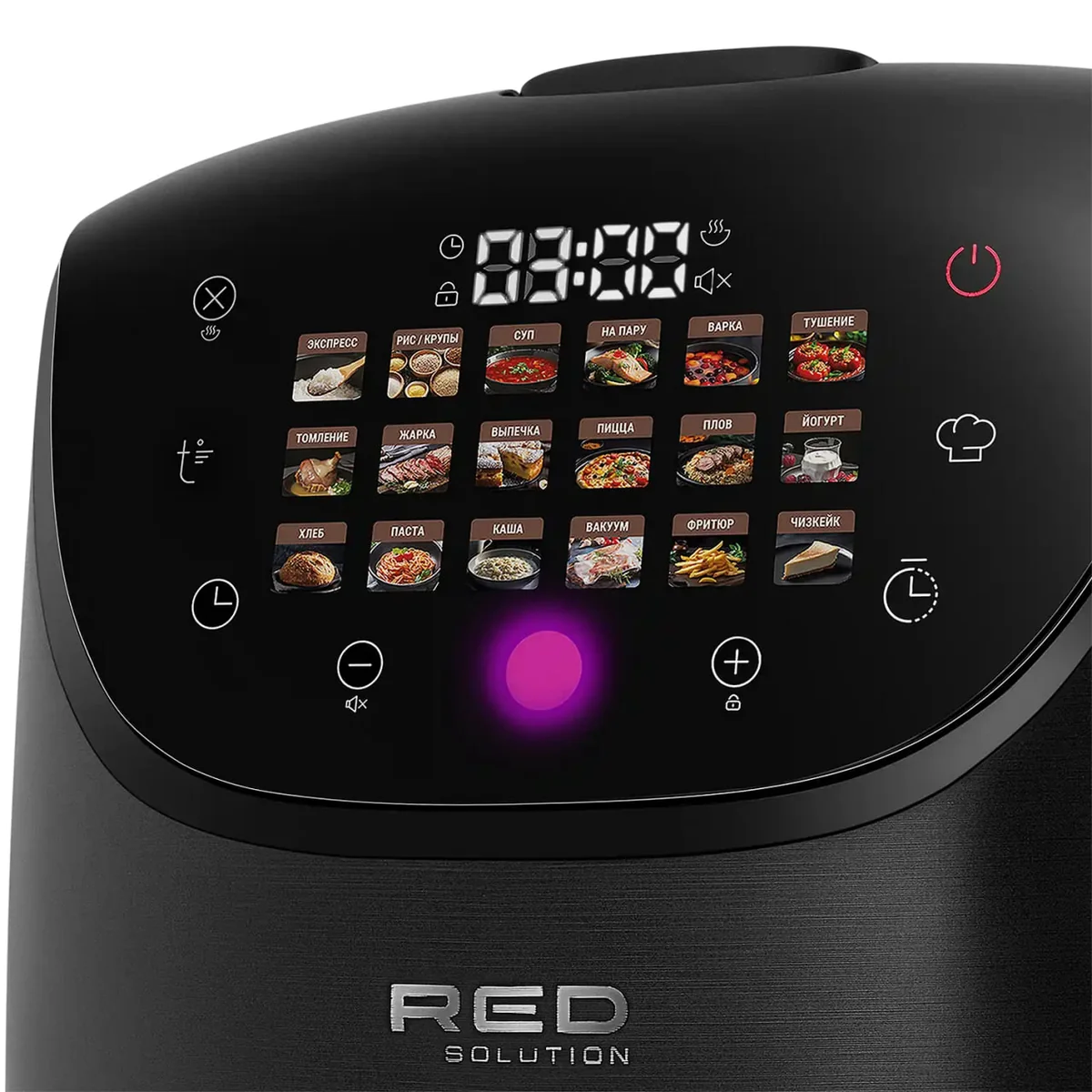 Яркая RGB-индикация наглядно покажет этап приготовления: красный — идет разогрев, оранжевый— идет приготовление, зеленый индикатор — завершение приготовления. При установке отложенного старта индикация загорается фиолетовым цветом. Следить за процессом приготовления стало еще удобнее и проще.