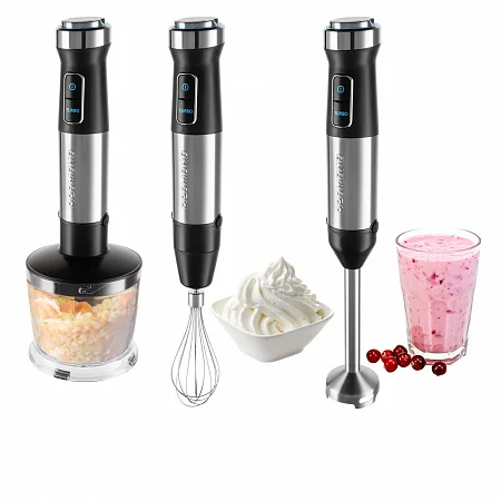- • Погружной блендер позволит протереть мягкие овощи, фрукты или отварное мясо для детского питания, смешать ингредиенты для крем-супа или домашнего майонеза в объемном мерном стакане. Используя блендер, вы также легко приготовите натуральные лимонады, молочные коктейли и витаминные смузи для всей семьи.