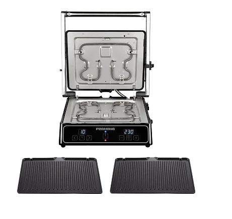 - Электронное управление. На панели гриля расположены дисплей и кнопки, которые позволяют вручную настроить устройство.