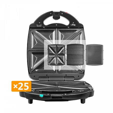 Прибор «Мультипекарь» RMB-M716/3 – находка для большой семьи. Благодаря увеличенному размеру устройства вы за несколько минут поджарите 8 котлет на панели RAMB-126 (Бургер), сделаете 8 горячих бутербродов на пресс-форме RAMB-101 (Сэндвич). За одну закладку ингредиентов вы испечете 12 сахарных булочек на панели RAMB-105 (Пончики) или 10 венских вафель на панели RAMB-113 (Мини-вафли).