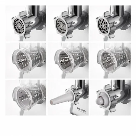 RMG-1216-8 можно пользоваться как мультирезкой. Для этого предусмотрены 4 насадки: крупная и мелкая терка, шинковка и насадка для нарезки соломкой. Шинковка поможет ускорить заготовку квашеной капусты на зиму, приготовление борща, щей и капустных салатов. Крупная терка незаменима, если нужно приготовить оладьи из кабачков или свекольную икру для всей семьи. Воспользуйтесь мелкой теркой, чтобы сделать детское питание, из проверенных продуктов, которые нравятся вашему ребенку. Насадка для нарезки соломкой пригодится любителям картофеля фри и летних витаминных салатов.