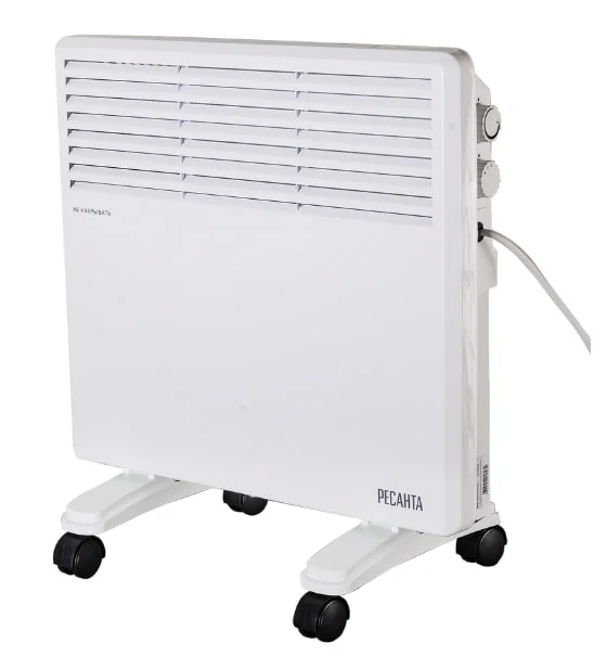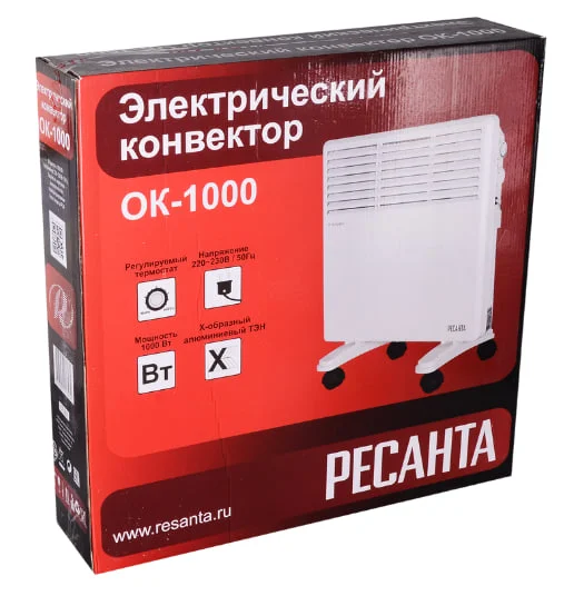 Конвектор данной модели комплектуется монолитным Х-образным нагревательным элементом. Для удобства эксплуатации предусмотрены разные температурные режимы. Высокоточный термостат поддерживает заданную температуру в помещении. Устанавливаться электроконвектор РЕСАНТА ОК-1000 может на стену или пол. Для простого перемещения он комплектуется колесиками. Имеет небольшой вес и компактные размеры. Работает бесшумно, может использоваться в дневное и ночное время. К преимуществам модели стоит отнести и высокую пожарную безопасность, прибор имеет встроенную термозащиту. Так как электрообогреватель данного типа имеет уровень защиты IP24, его можно устанавливать даже в помещении с повышенной влажностью.