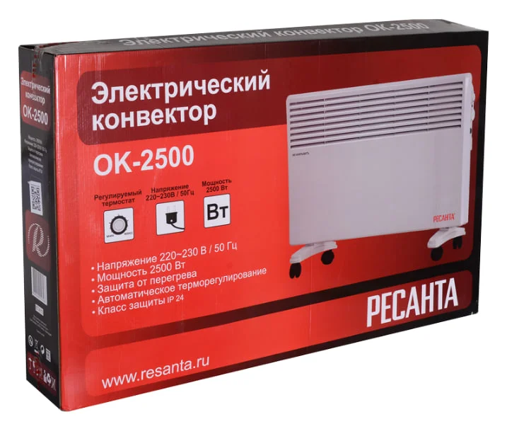 Конвектор имеет терморегулятор, может работать на двух мощностях 1.25 и 2.5 кВт и рассчитан на обогрев помещения площадью до 30 м². Органы управления удобно расположены на боковой части конвектора. Питание осуществляется от обычной бытовой сети 220 В, 50Гц. Сетевая вилка в комплекте. Электроконвектор Ресанта ОК-2500 получил систему термозащиты. Прибор может устанавливаться на полу или монтироваться на стену. Для напольной установки в комплекте конвектора имеются специальные опоры с колёсами, а для настенного крепления – набор крепёжных элементов. Класс защиты от воды и пыли – IP 24.