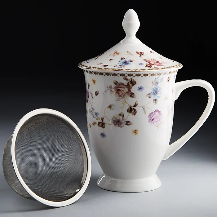 - Кружка с крышкой заварочная из высококачественного фарфора с декоративным рисунком и золотой обводкой