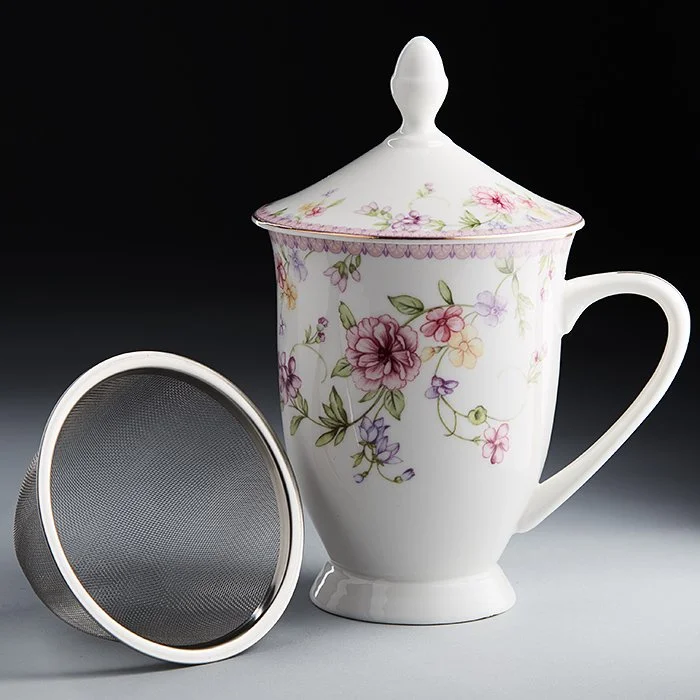 - Кружка с крышкой заварочная из высококачественного фарфора с декоративным рисунком и золотой обводкой