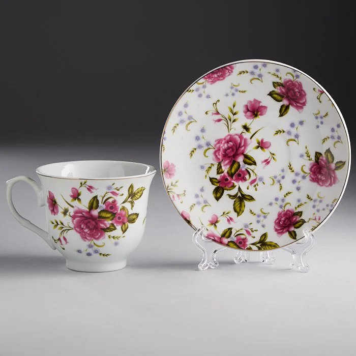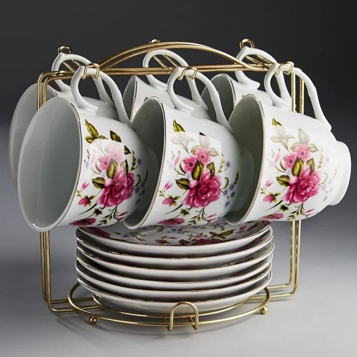- Набор чайный из высококачественного фарфора с декоративным рисунком на металлической подставке
