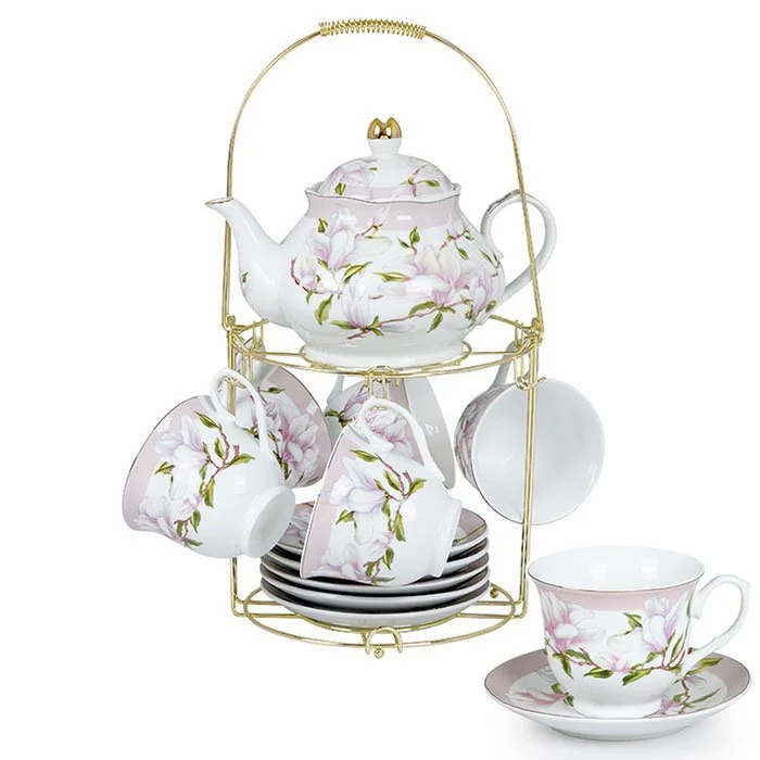 - Набор чайный из высококачественного фарфора с декоративным рисунком на металлической подставке