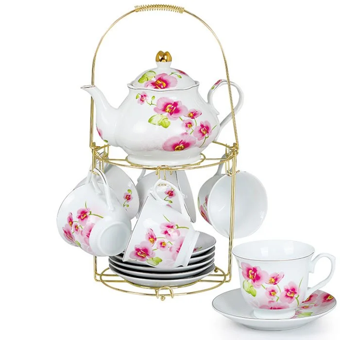 - Набор чайный из высококачественного фарфора с декоративным рисунком на металлической подставке
