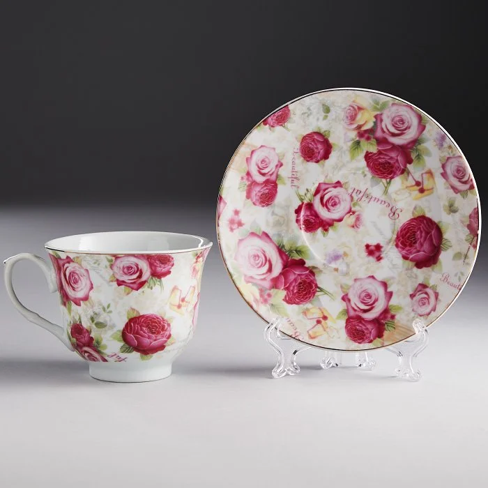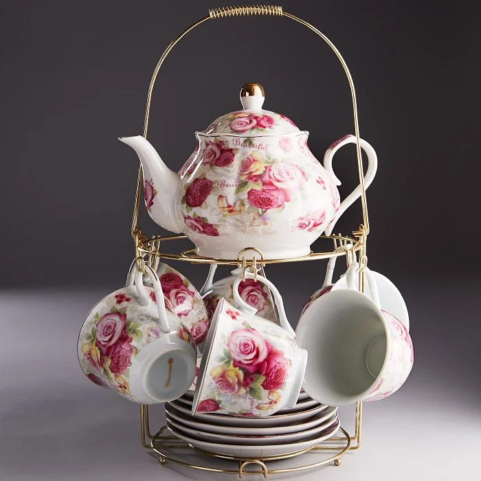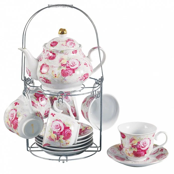- Набор чайный из высококачественного фарфора с декоративным рисунком на металлической подставке