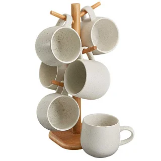 Набор кружек 6 предметов (420 мл) на деревянной подставке Ф19-141K/6 белый ROSARIO