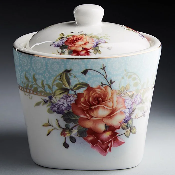- Сахарница из высококачественного фарфора с декоративным рисунком и золотой обводкой