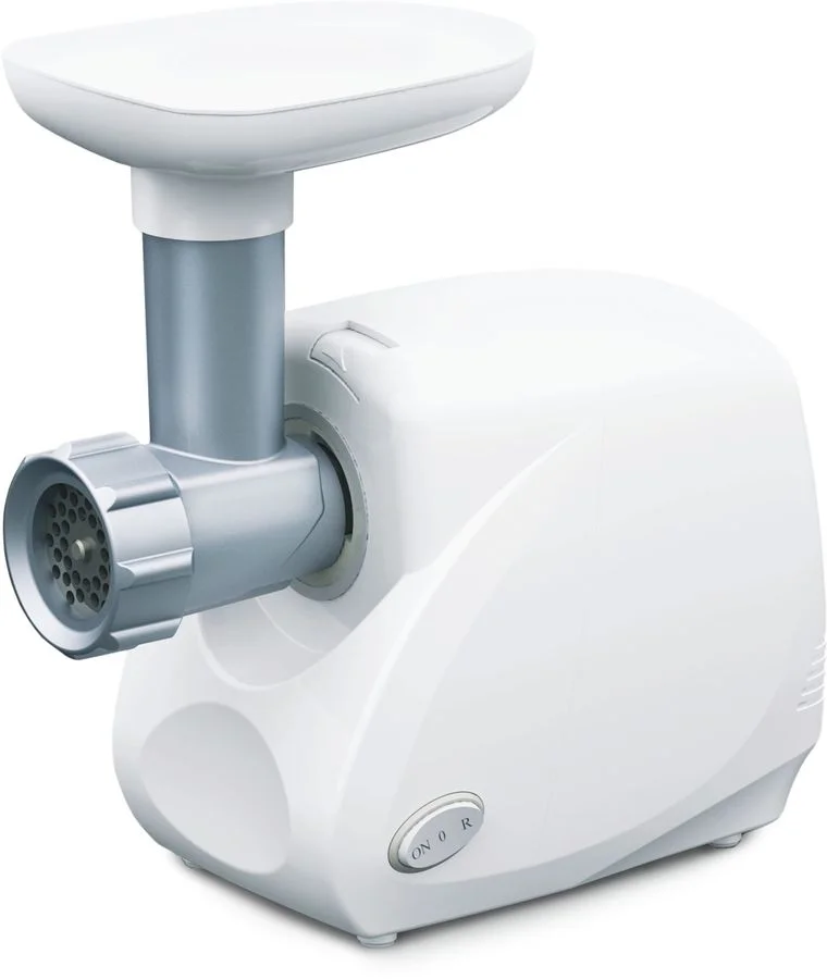 Электрическая мясорубка предназначена для изготовления фарша из мяса, рыбы, грибов, нарезки овощей и фруктов. Корпус мясорубки и приемного лотка для продуктов изготовлены из прочного пластика белого цвета, на нижней части корпуса расположены прорезиненные ножки для дополнительной устойчивости.