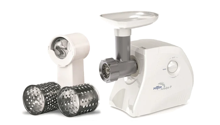 Электрическая мясорубка "Ротор-Альфа-Р" поможет приготовить мясной и рыбный фарш, а также натереть, нашинковать или тонко нарезать овощи, фрукты и сыр. Мясорубку можно использовать как соковыжималку для ягод, мягких фруктов и овощей. Тип мясорубки – шнековый. Доступны несколько комплектаций насадок и приставок: насадка – соковыжималка и приставка- овощерезка (ломтерезка, шинковка крупная, терка). Данная модель снабжена функцией "реверс": кратковременно меняется направление вращения шнека приставки-мясорубки.