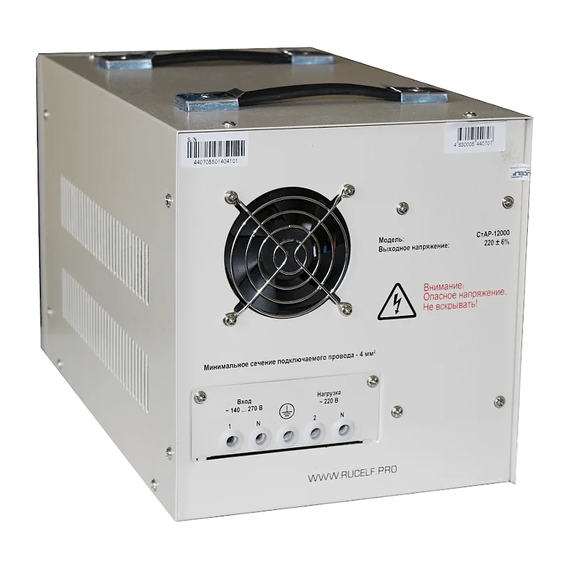 Стабилизатор напряжения RUCELF СтАР-12000 выравнивает напряжение в однофазной сети. Небольшой вес и габариты позволяют легко перемещать и устанавливать прибор. Табло индикации отображает параметры входного и выходного напряжения, а также причину срабатывания защиты. Применяется для радио- и телеаппаратуры, бытовых котлов и осветительныx приборов.