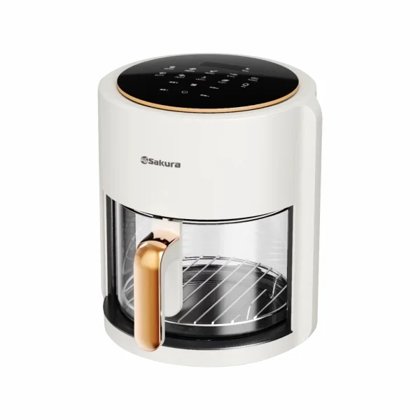 Аэрогриль, 1300 Вт, стеклянная чаша с решеткой 5 л, таймер на 60 минут, регулировка температуры 30-180С, сенсорное управление, LED дисплей, готовит без масла или с минимальным его использованием. Автоматическое отключение питания при извлечении чашы, 10 предустановленных программ меню. Подходит для всех блюд, которые готовятся в духовке. Шнур резиновый 1 м. Цвет корпуса белый.